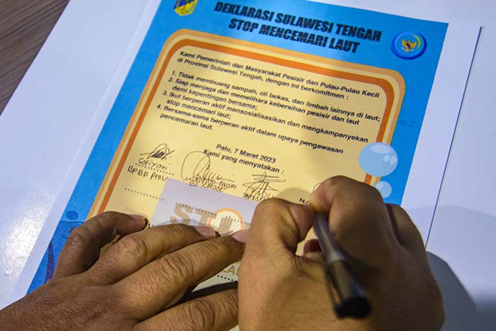 PALU, beritapalu | Sebuah komitmen bersama untuk menghentikan pencemaran di laut dideklarasikan di Palu, Sulawesi Tengah, Selasa (7/3/2023) ditandai dengan pembacaaan naskah komitmen sekaligus penandatanganannya.